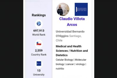 En un contexto donde la nutrición y la salud pública se convierten en prioridades clave para el desarrollo sostenible, el académico Claudio Villota, bioquímico y doctor en biología celular y molecular de la Universidad Bernardo O’Higgins (UBO), ha sido reconocido en el prestigioso AD Scientific Index, situándose entre los investigadores destacados en el área de nutrición y dietética en Chile. Su enfoque científico no solo se desarrolla desde el laboratorio, sino también desde una profunda preocupación por el bienestar de las personas, articulando evidencia, docencia e impacto social.